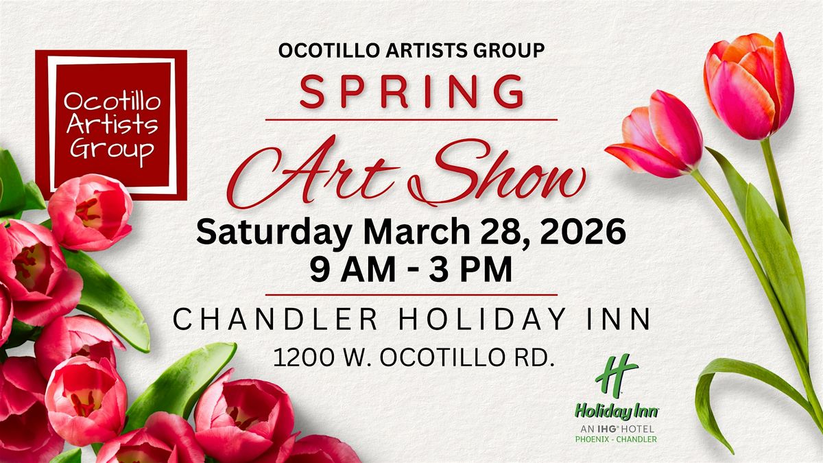Welcome to the Ocotillo Artists Group Spring Art Show! Join us for a vibrant display of creativity at the Holiday Inn Phoenix - Chandler by IHG. Our talented artists will showcase a variety of fine art including paintings, jewelry, ceramics, woodwork, fiber art, photography, glass and more. Come and support local artists while enjoying a day filled with art and inspiration. Don't miss out on this opportunity to immerse yourself in the world of art! !