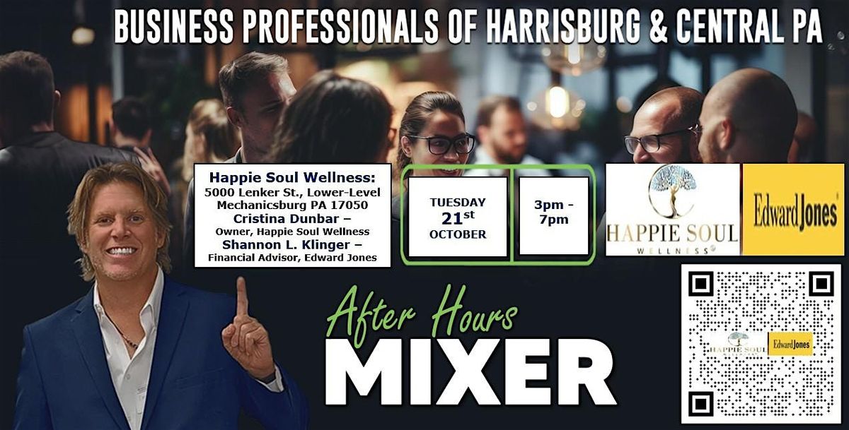 Mark your calendars and SAVE THE DATE for our Tuesday OCTOBER 21st After-Hours Networking Event co-hosted with HAPPIE SOUL WELLNESS (Happie Soul Wellness) and Shannon L. Klinger - Edward Jones Financial Advisor (Shannon L Klinger, Financial Advisor | Edward Jones) at the expanded Happie Soul Wellness Studio, 5000 Lenker St., Lower-Level Mechanicsburg PA 17050 , with the "Business Professionals of Harrisburg & Central PA" 3:pm - 7:pm.