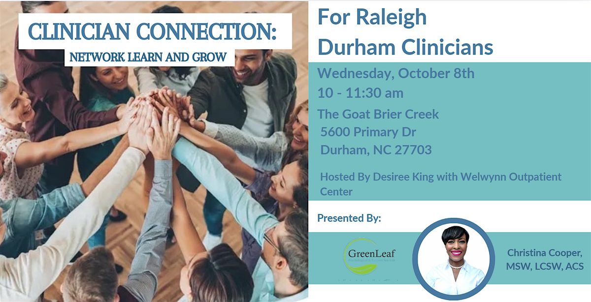 linician Connection is a free networking and educational event that takes place every other month on the 2nd Wednesday from 10:00–11:30 AM at The Goat in Brier Creek. It’s a space for clinicians and providers to connect, learn, and share valuable resources. Breakfast and coffee are provided.