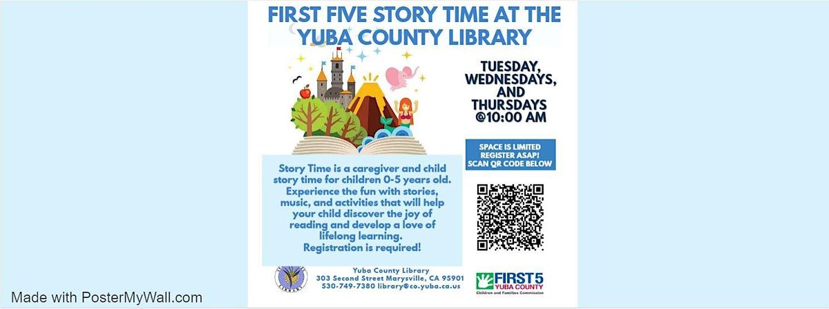 Please register for our First Five Story Time. First 5 Story Time is a story time for caregivers and their children ages 0-5. Children will have time to free play with other kids before we read our story and complete a craft. For more information please call us 530-749-7380 or email us at [email protected]