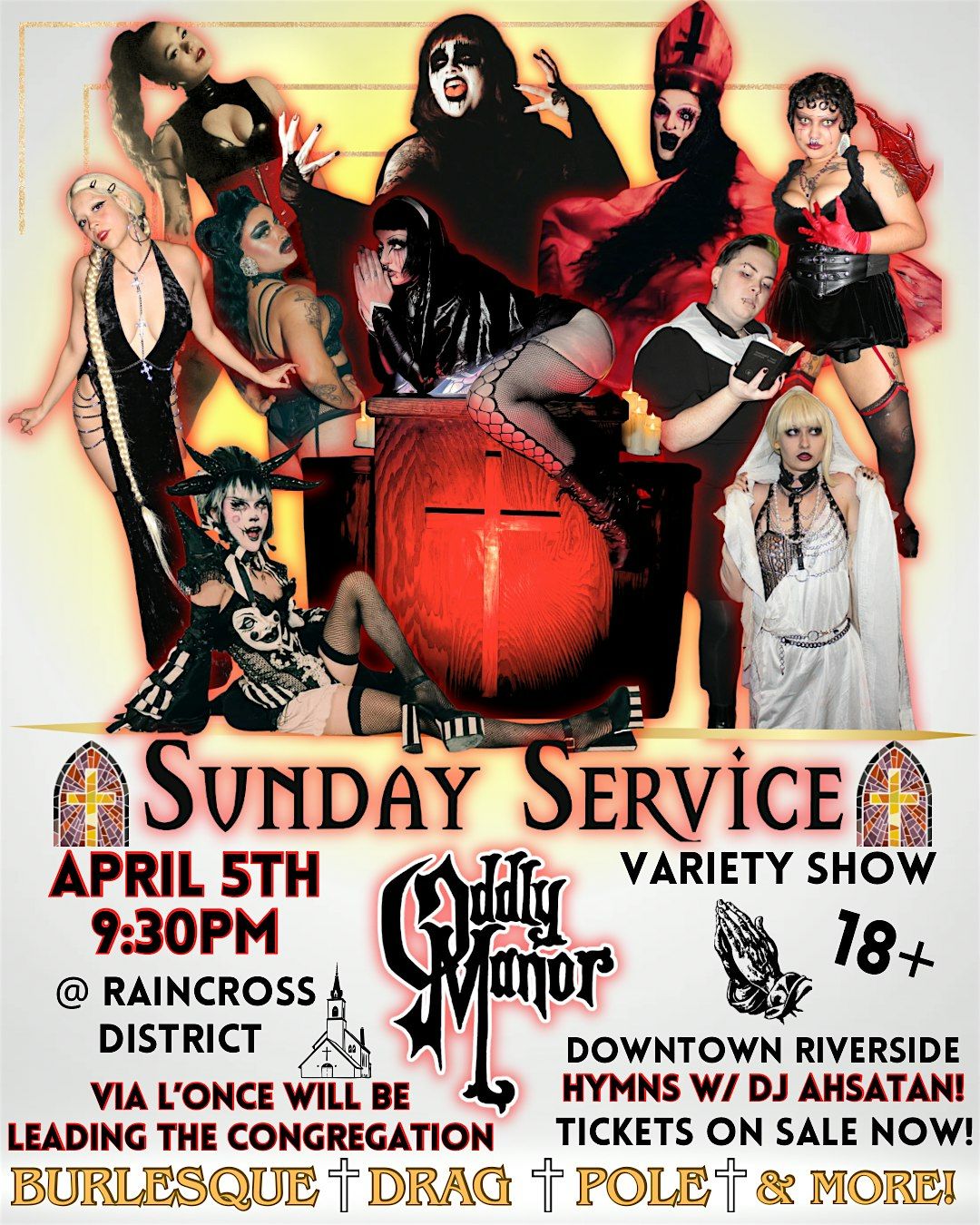 This event will contain dark music, imagery, suggestive numbers, & may offend those who adhere to religion. This is our way of taking back our religious trauma & making our own art. It may not be for everyone but you’re invited to join our Sunday Service!