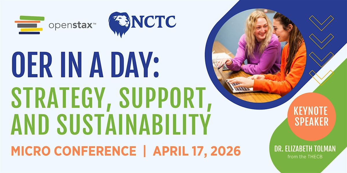 Join us for a great day of learning at OER in a Day: Strategy, Support, and Sustainability. Breakfast and lunch will be served at this free micro-conference. Our keynote address will be from Dr. Elizabeth Tolman from the Texas Higher Education Coordinating Board (THECB).