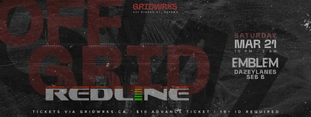 OFF GRID features a verity of underground electronic niche sounds. A deeper cut into the underground, away from the noise, into the raw and industrial. Every Week will feature guest DJs that will serve as the musical hosts, taking the audience on their desired journey throughout the course of the event.This Saturday features sets from EMBLEM, SEB B & OUT TO LUNCH10pm-2amCity Gridwrks221 Rideau St19+