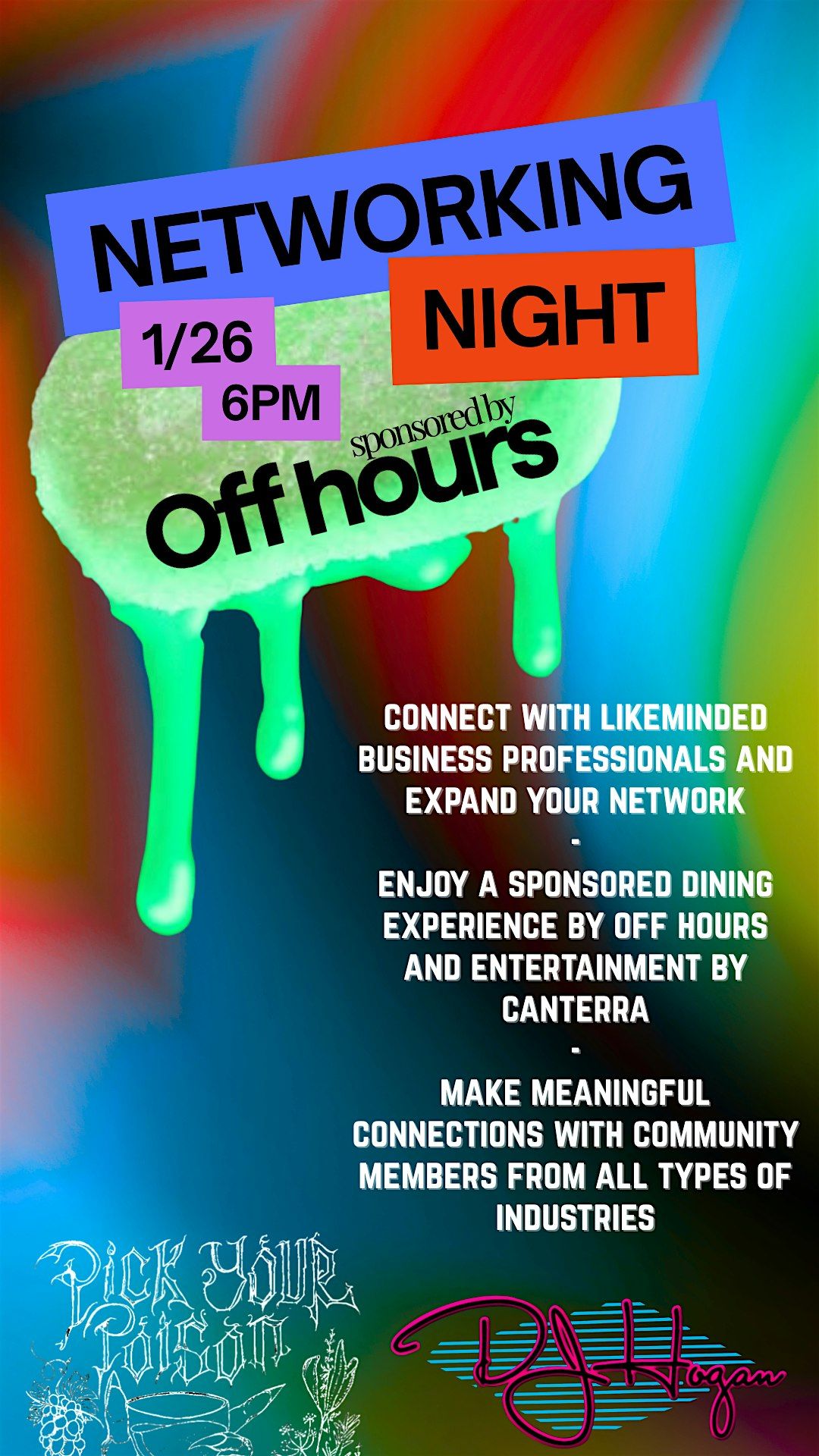 Looking to unwind and make some valuable connections? Join us for an in-person evening at Canterra sponsored by Off Hours, made for anyone in the community. Whether you're making new business connections or just learn about a different industry, this is the perfect spot to network after hours. Grab a drink, share some laughs, and build your community in a laid-back setting. Entertainment by DJ Hogan and food catered by Pick Your Poison. Don’t miss out on a night of great conversations and new possibilities!