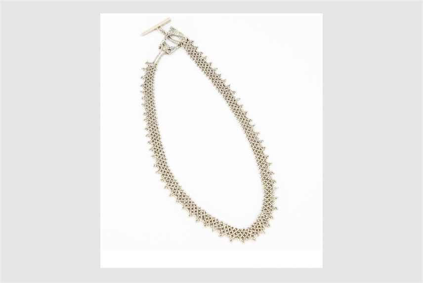 Students will learn off-loom bead weaving through the vertical netting technique, which allows participants to create a striking mesh collar inspired by one famously worn in the popular HBO series The Sopranos. While the original design incorporated platinum, this version is equally beautiful and instead utilizes seed beads. Students will learn how to weave mesh without graphs, resulting in a piece that is straightforward to construct yet technical in appearance. This class is well-suited for both beginners and experienced beaders. Kits include all beads required to complete the collar, along with stringing materials and clasps. Larger beads will also be available for those who prefer them.