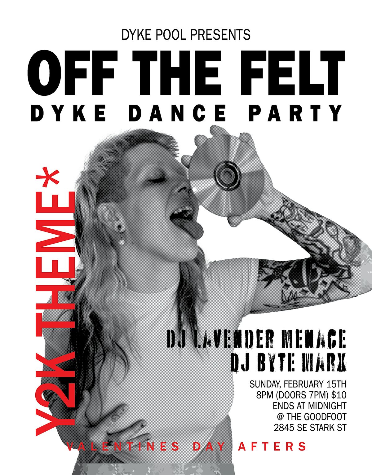 Dyke Pool represents Off the Felt, a dance event at The Goodfoot (Downstairs) for the queer community and allies, with aspirations of making it a monthly occurrence. The night will feature two DJs playing back-to-back sets from 8:00 PM to 12:00AM. Doors will open at 7:00 PM to allow for presales, check-in, and socializing. This event aims to provide a safe, fun, and energetic space for dancing, community, and celebration. $10