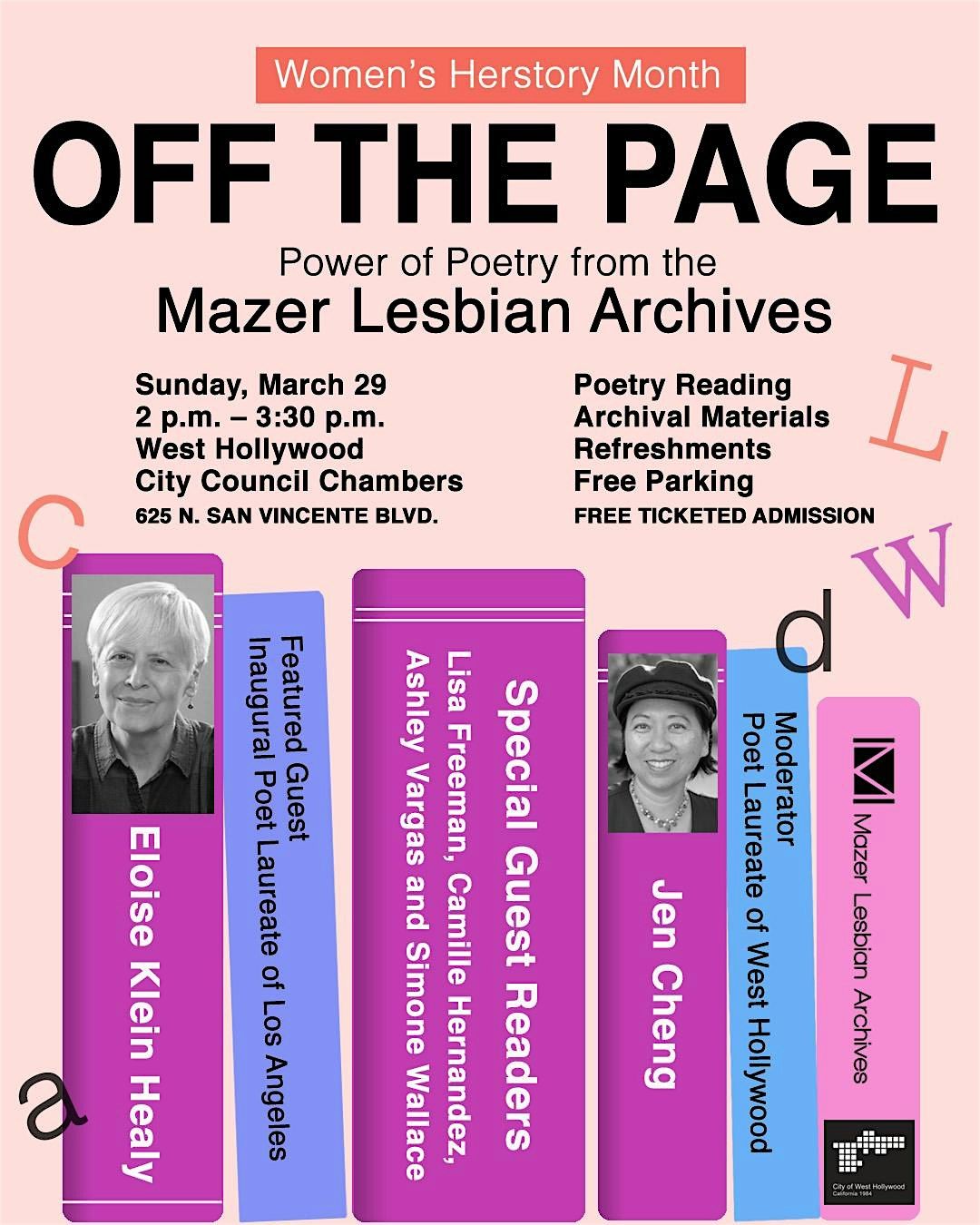 Featured guest - Inaugural Poet Laureate of Los Angeles, Eloise Klein Healy. Moderated by Poet Laureate of West Hollywood, Jen Chang. Special guest readers: Lisa Freeman, Camille Hernandez, Ashley Vargas, and Simone Wallace.