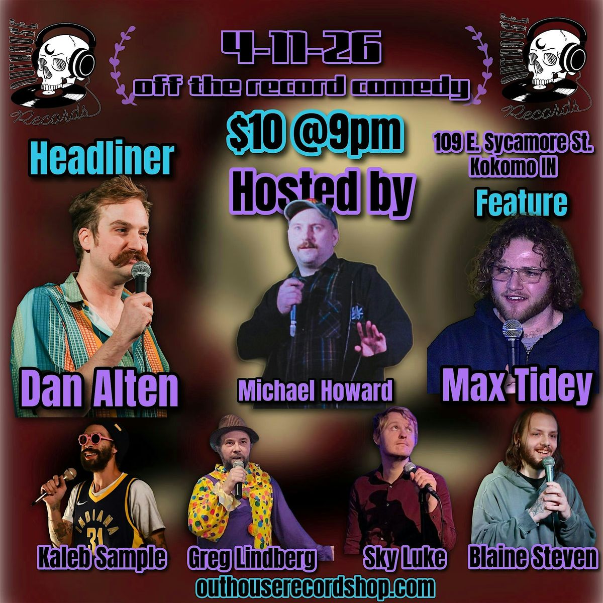 Get ready for a night full of laughs at 109 E Sycamore St. Kokomo IN. Join us on April 11, 2026 at 9:00 PM (EDT) for some hilarious off-the-record comedy that you won’t want to miss. Bring your friends, enjoy the vibe, and get ready to crack up in a chill, in-person setting. It’s the perfect way to unwind and have a blast! Hosted by the the best host a comedy club can have,Michael Howard. Your Headliner for the night is Dan Alten who I met at Harvestfest I needed him for the shop. Dan Alten is a charming goofball from Kentucky who has been traveling the country for the past decade doing about 200 shows a year bringing his intelligently surreal bebop nonsense everywhere from theaters to punk basements to art galleries to beloved comedy clubs with a knack for making audiences feel like they're on a good psychedelic trip without the drugs. We also have your feature Max Tidey who I met as well at Harvestfest. Other hilarious comics on this bill like, Kaleb Sample who is no stranger to the Outhouse. Greg Lindberg, Sky Luke and Blaine Stevens. Stay for the laughs buy some merch at Outhouserecordshop.com to show your support for local businesses