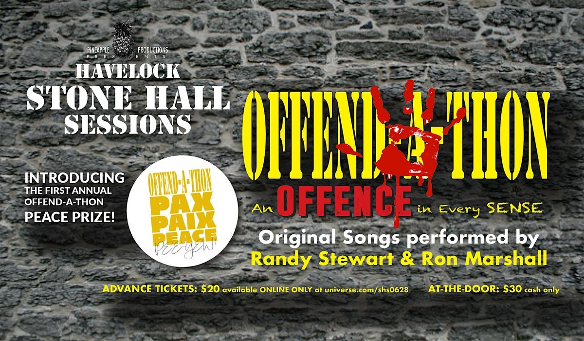Pineapple Productions is excited to have back by popular demand, OFFEND-A-THON 5 - An Offence in Every Sense - featuring the distinctive original songs of two area performers - Randy Stewart and Ron Marshall.