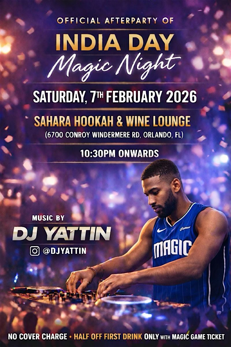 Join us for the Official Afterparty of India Day Magic Night! The festivities continue late into the night at Sahara Hookah & Wine Lounge. Get ready for an unforgettable evening of music, dancing, and celebration.