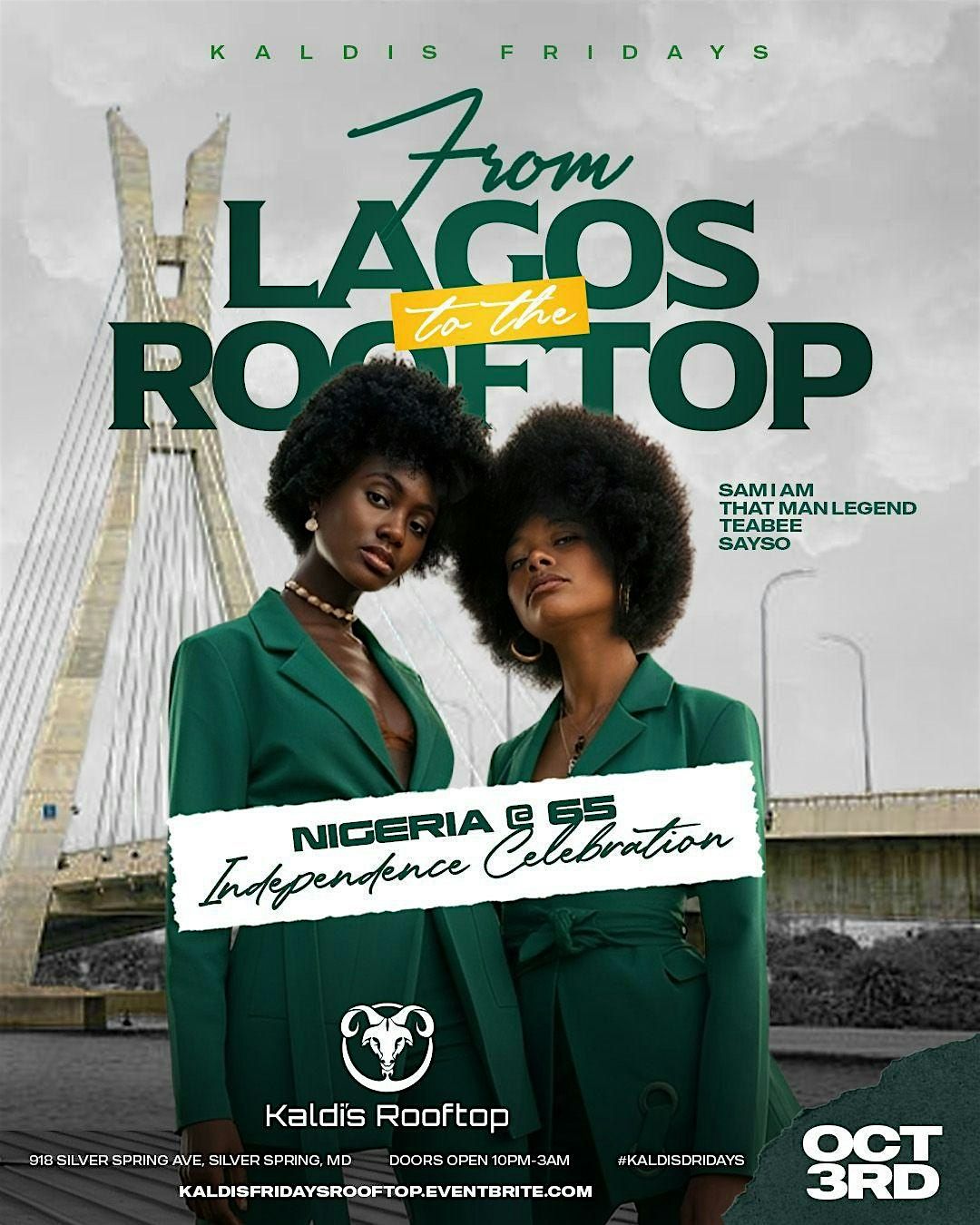 Come join us at Kaldis Social House Rooftop as we commemorate Nigeria's independence in style. Get ready for a night filled with vibrant music and a lively atmosphere. This in-person event promises to be a memorable experience for all attendees.