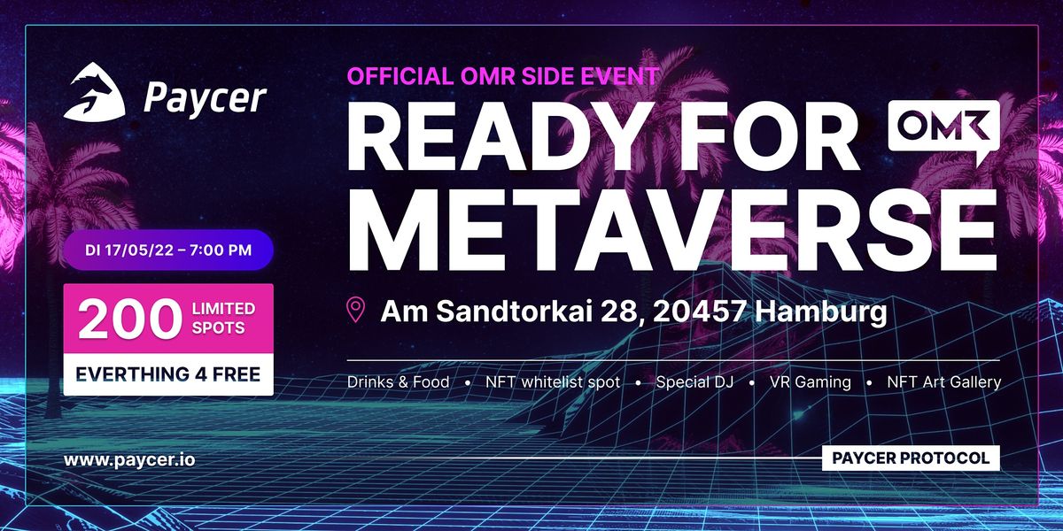 The DeFi company Paycer is organizing a Metaverse Party as a collaboration with OMR festival and VRHQ. We would love to have you there! Spend a night with Metaverse pioneers and blockchain professionals. Grow your network and learn about the new technologies.