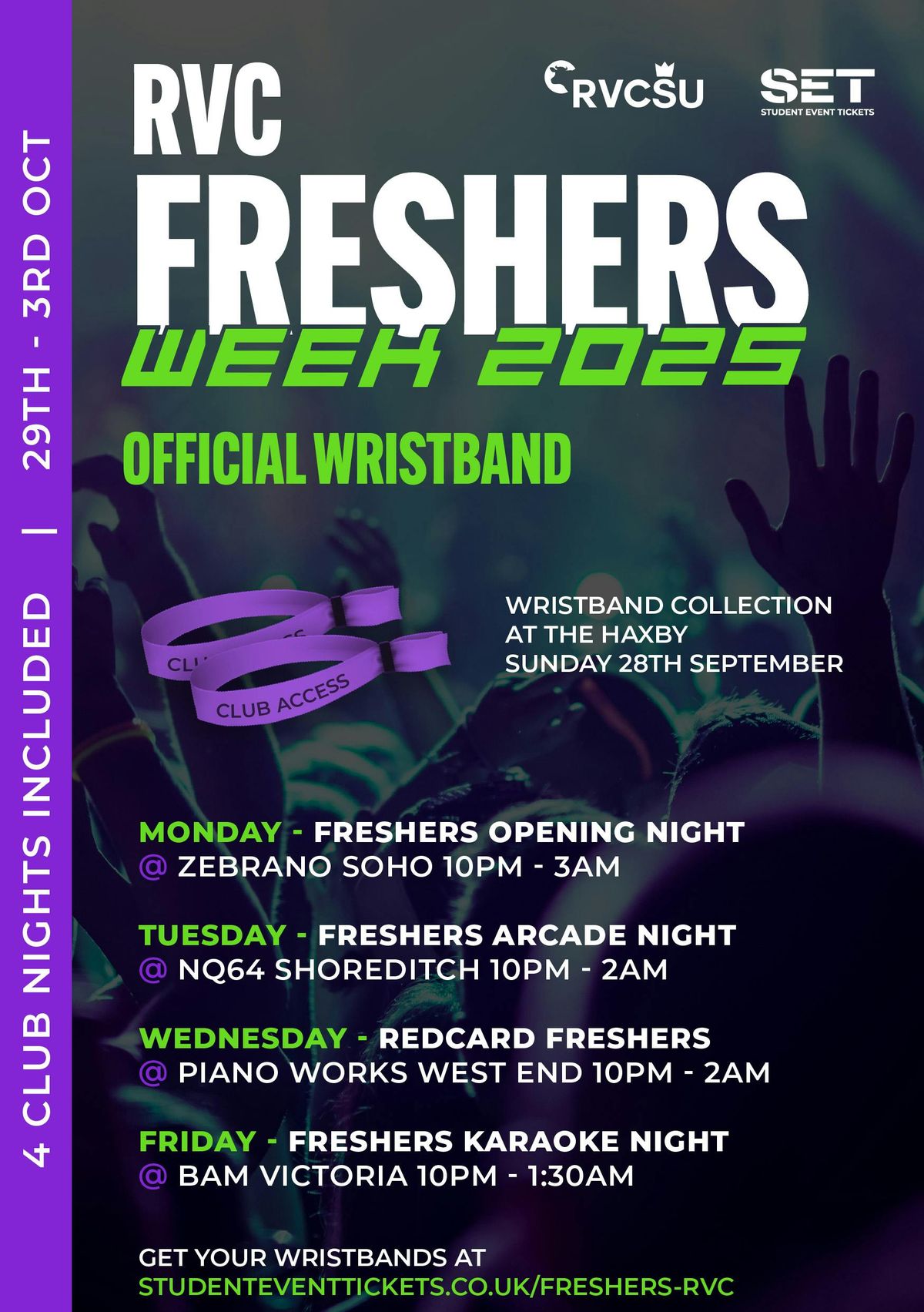 Introducing the Official RVC Freshers Wristbands 🎟Each wristband includes entry to each of the below events throughout RVC Freshers Week from Monday 29th September – Friday 3rd October ️⚡️This wristband covers a week of nights that are perfect for meeting new people and getting stuck into the London student life.Monday: Freshers Opening Party @ Zebrano Soho // 10pm – 3amThrowback hits all night long with drinks from £3! Last entry is 2am, with doors shutting at 3am. Kick off your Freshers week in style 🪩Get your individual tickets hereTuesday: Arcade Night @ NQ64 Shoreditch // 10pm – 2amEach student receives exclusive drinks offers with shots only £3.50, and a cup of tokens which can be used on over 50 arcade games and dance machines! Plus entrance (via our slide!) to the coolest neon venue in London🕹️Get your individual tickets hereWednesday: Redcard Sports Night @ Piano Works West End // 10pm – 2amRally the troops and get your teammates ready for RVC’s favourite night of the year!Kicking off our Redcard journey at Piano Works West End with drinks from £3! Crazy costumes, 500 RVC students and a dance floor with tunes ‘til 2am🤪Get your individual tickets hereFriday: Karaoke Night @ Bam Karaoke Victoria // 10pm – 1:30amWe’re going fancy for the Freshers finale! Whether you’re belting out your favourite tune or just vibing with a cocktail in hand, no judgement here... scream your heart out!🎤Get your individual tickets here