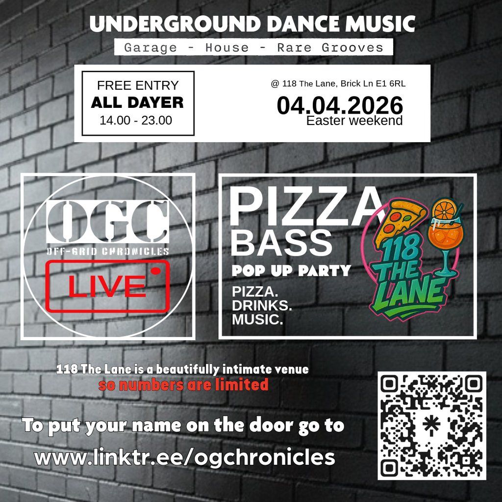Off-Grid Chronicles Podcast is breaking the seal with it's first pop up party of 2026 OGC Live - PIZZA BASS @ 118 The Lane April 4th Easter BH weekendMusic Genres : House, UK Garage, Breaks
