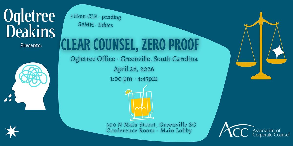 Join Ogletree Deakins and ACC South Carolina for an engaging afternoon focused on wellness, education, and connection. This 3-hour CLE event will feature sessions on mental health and substance abuse, followed by a fun and interactive mocktail making class with light snacks. We’ll wrap up the day with an ethics session to round out this informative experience.