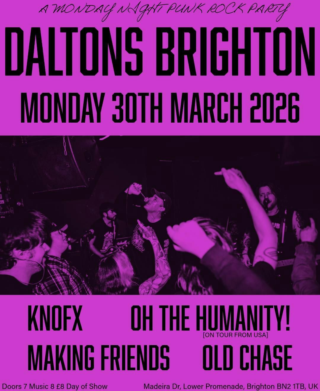 All the way from Massachusetts, Oh the Humanity! released one of the albums of the year in 2025 and we're buzzing to share the stage with them at Daltons. Local skatepunks Making Friends and Old Chase will warm you up, and the night will be topped off by Europe's premier NOFX cover band KNOFX. Being a Monday night we'll aim to finish at 1030pm.