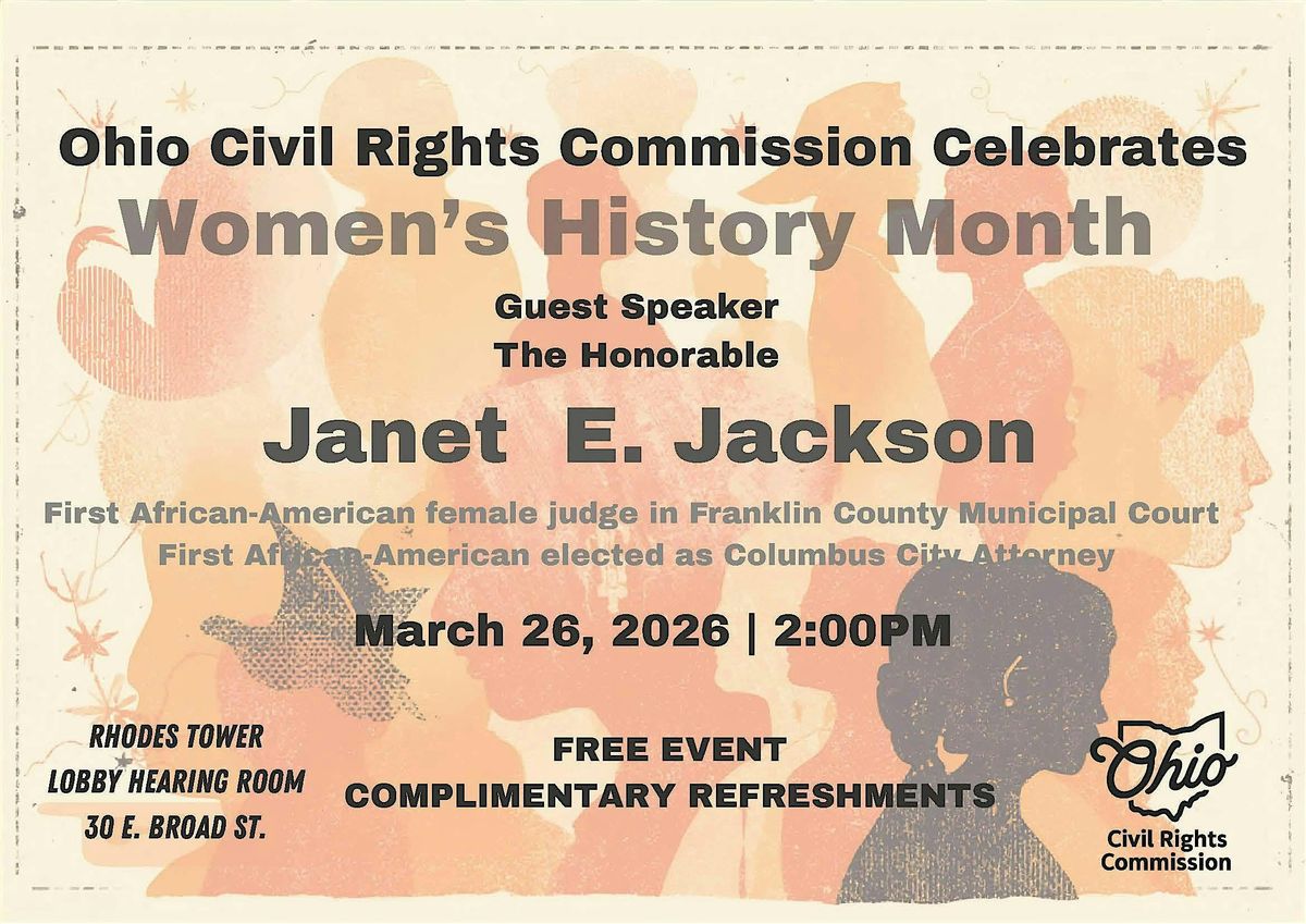 Join the Ohio Civil Rights Commission to celebrate Women's History Month with guest speaker the Honorable Janet E. Jackson, the first African-American female judge in Franklin County Municipal Court and the first African-American elected as Columbu City Attorney.