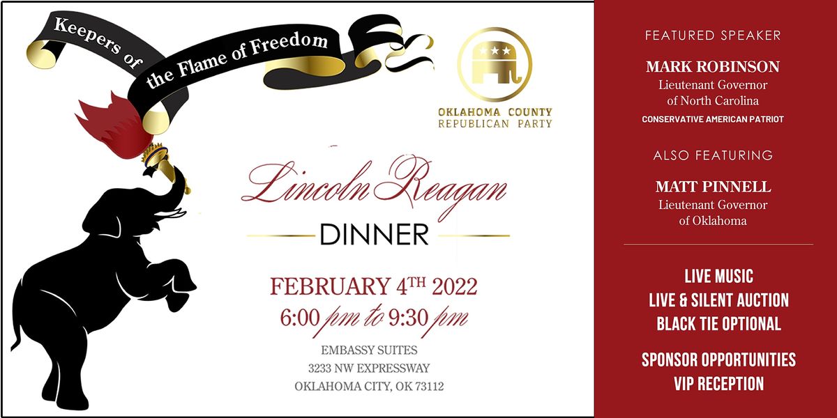 The Oklahoma County Republican Committee's Annual Lincoln Reagan Dinner will be extra special this February, so be sure to put Friday, February 4th on your calendar TODAY!