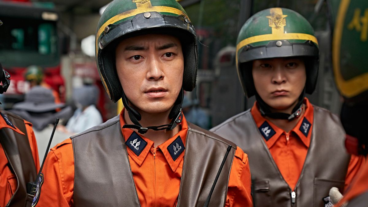 Firefighters, including newcomer Cheol-Woong, rush to the scene.