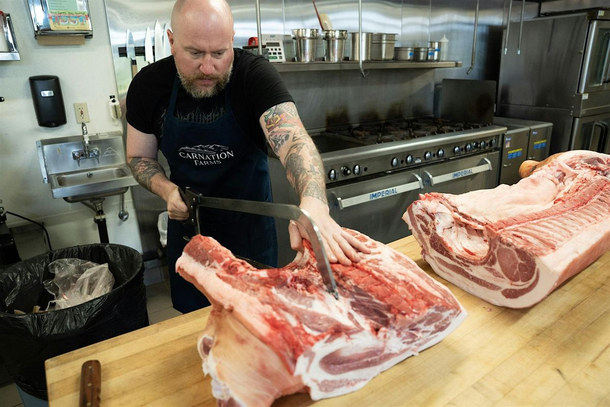 About our Butcher: Instructor Thomas Coss is a butcher and chef with over a decade of experience working with local farms and ranches in the PNW. He specializes in nose-to-tail butchery with a focus on ethical sourcing. His expertise has been a welcome addition to our culinary team. You most likely have tasted his work for yourself in our Farm-Cured Beef Jerky, Farm Meatballs, Smashburgers, and more!