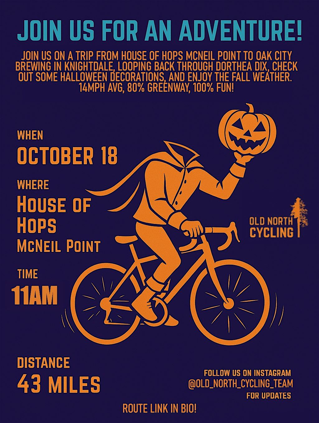 Join us on a trip from House of Hops McNeil Point to Oak City Brewing in Knightdale. Looping back through Dorthea Dix, check out some Halloween decorations, and enjoy the fall weather. 14mph avg (or less), 80% greenway, 100% fun!