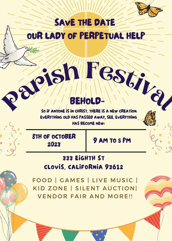 You are invited to join us for our annual Parish Festival! It is a great time to be had for all! There will be Food, games, live music, Kidzone, silent, auction, vendor, fair, and more!
