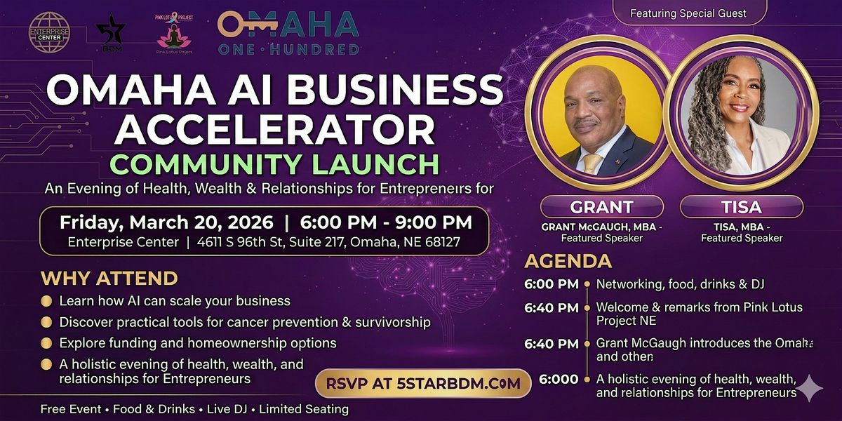 Connect with entrepreneurs, small business owners, and community leaders from across Omaha while learning how AI can help grow your business. Hear from Omaha 100 about funding and homeownership resources, experience a wellness spotlight from Pink Lotus Project Nebraska, and meet Grant McGaugh and Tisa, co-hosts of the Health, Wealth & Relationships Podcast.