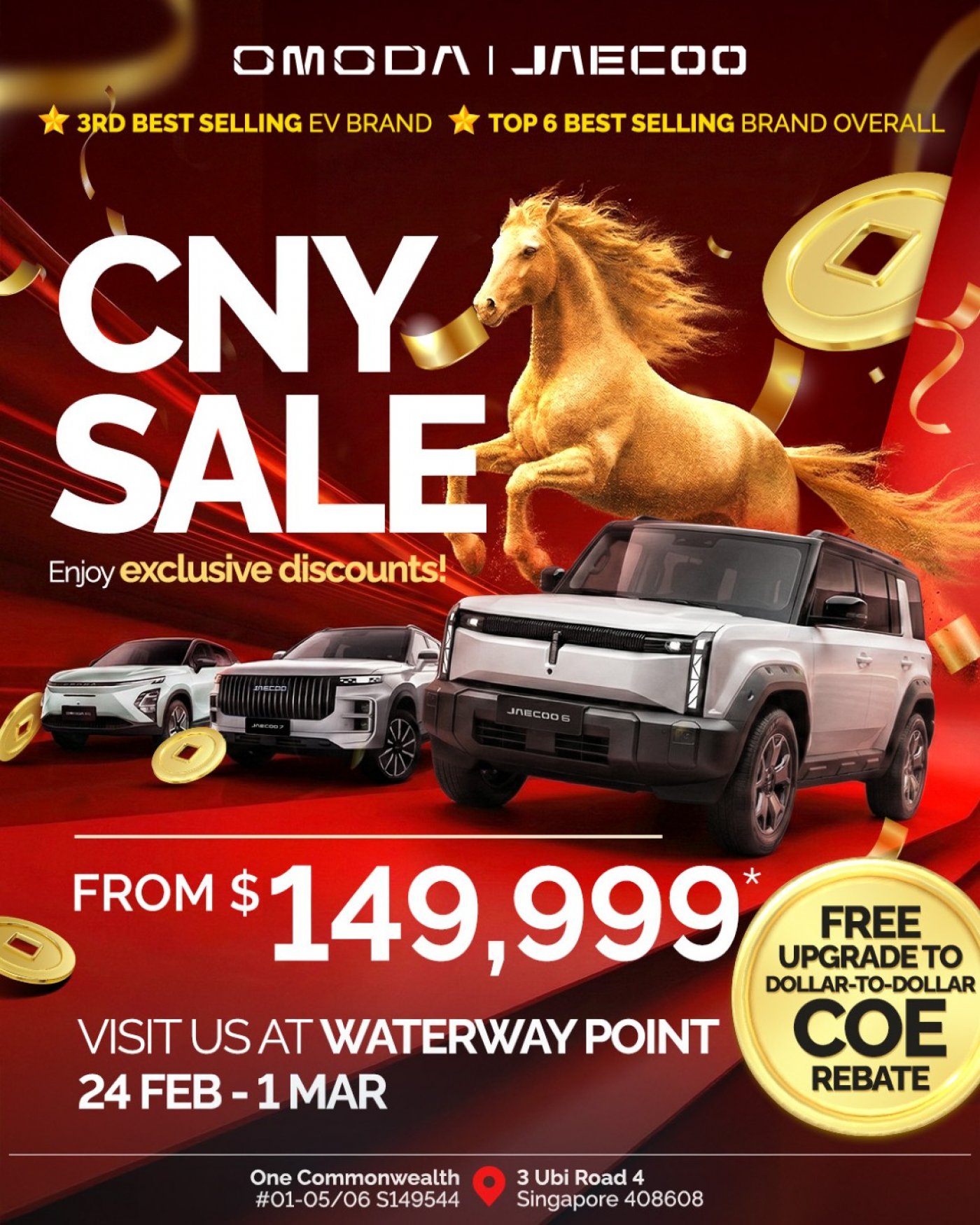 Join us at the Omoda & Jaecoo CNY Sale at Waterway Point with exclusive CNY discounts and giveaways* across the Omoda & Jaecoo range of New Energy Vehicles!