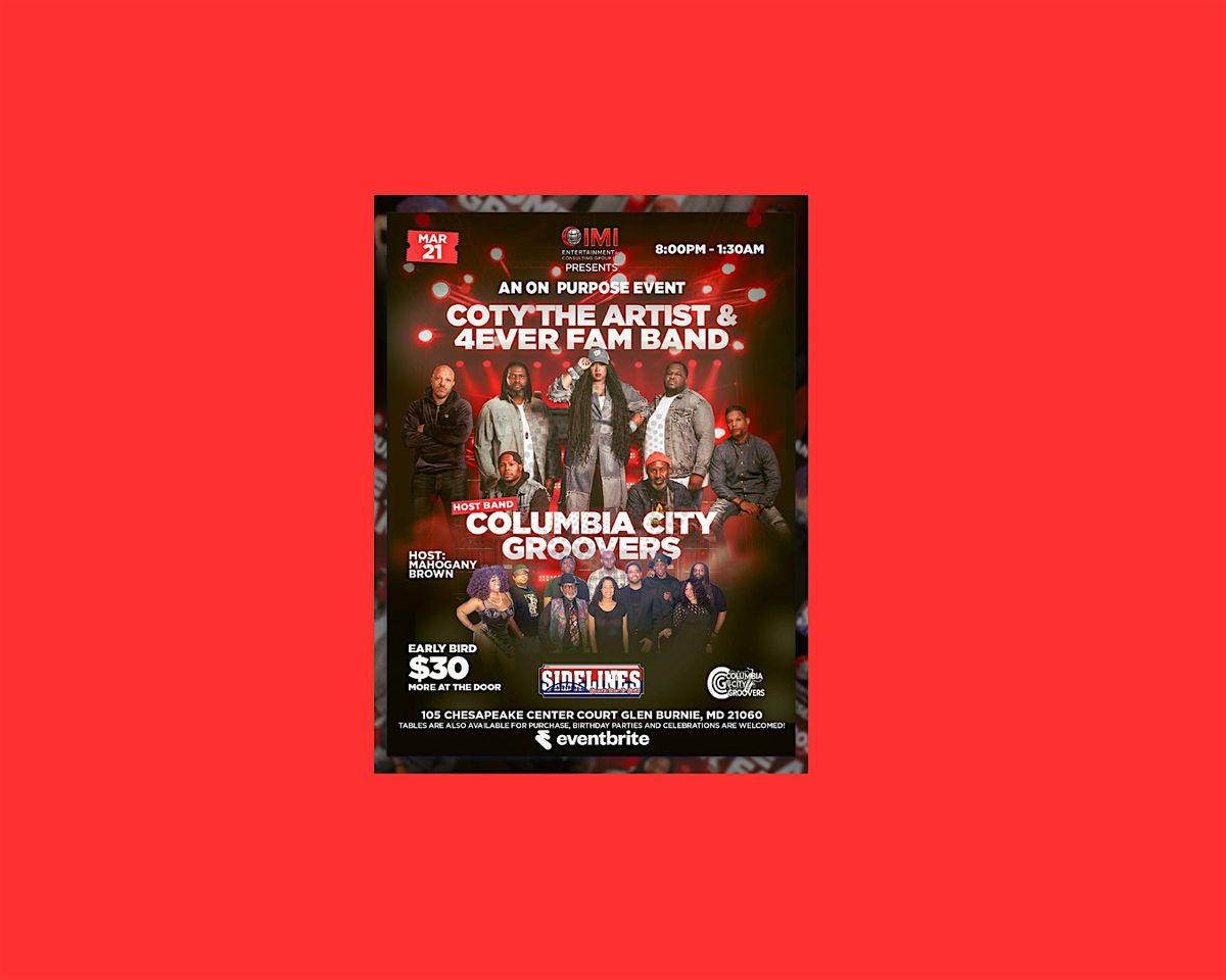 Join us at Sidelines Sports Bar & Grill on March 21, 2026 at 8:00 PM (Eastern Time) for an unforgettable live show. Chill vibes, great music, and an awesome crowd await you. Don’t miss out on this chance to catch Coty The Artist and the 4Ever Fam Band bringing the house down. With the Columbia City Groovers warming up the stage. Also featuring IMI own, the smooth sound of Danny G. Grab your friends and we outside!!!!!!