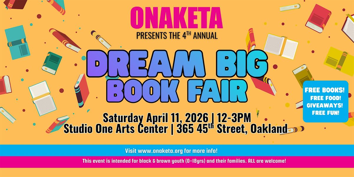 Join us for Onaketa's Annual Dream Big Book Fair, a fantastic family fun day at the Studio One Art Center in Oakland! Experience the excitement with a live DJ, delicious food, and the opportunity to grab BRAND NEW FREE CHILDREN'S BOOKS for kids and teens aged 0 to 18. Don't miss out on this unforgettable event on Saturday, April 11th!