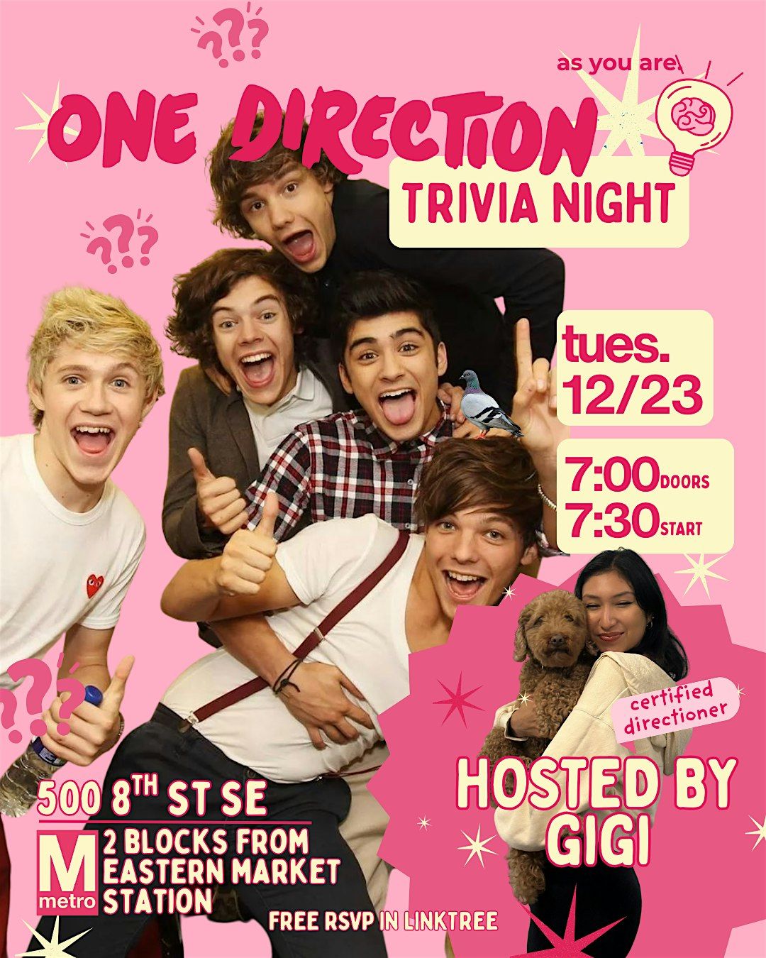 Are you a true directioner? Did you binge read 1D wattpad fanfiction?? Do you still strangely know their fun facts?? Join us for One Direction trivia!! Gigi-- a true Directioner-- will be your host!! No cover, 21+, doors at 7pm and start is at 7:30!!