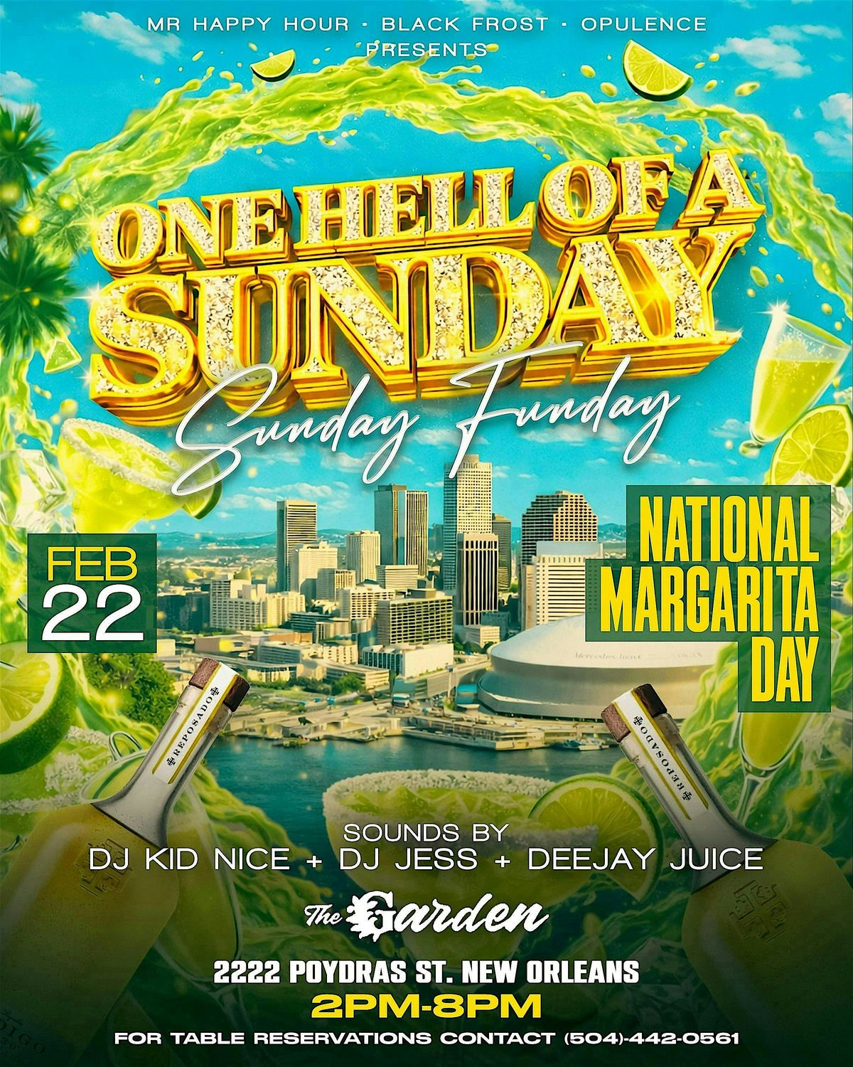 Mr. Happy Hour, OPULENCE and Black Frost come together to bring you One Hell of a Sunday! National Margarita Day Party. Sunday, February 22 from 2p to 8p.