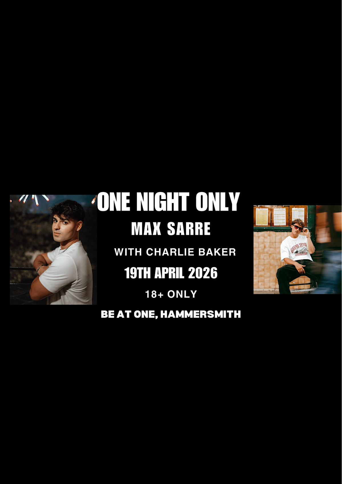 Ready for an epic night out? Join us in person for a one-time show featuring the amazing Max Sarre & Charlie Baker! It's the perfect chance to catch some live vibes, great tunes, and a fun atmosphere at Be At One. Don’t miss this unique event—come hang, dance, and make memories!