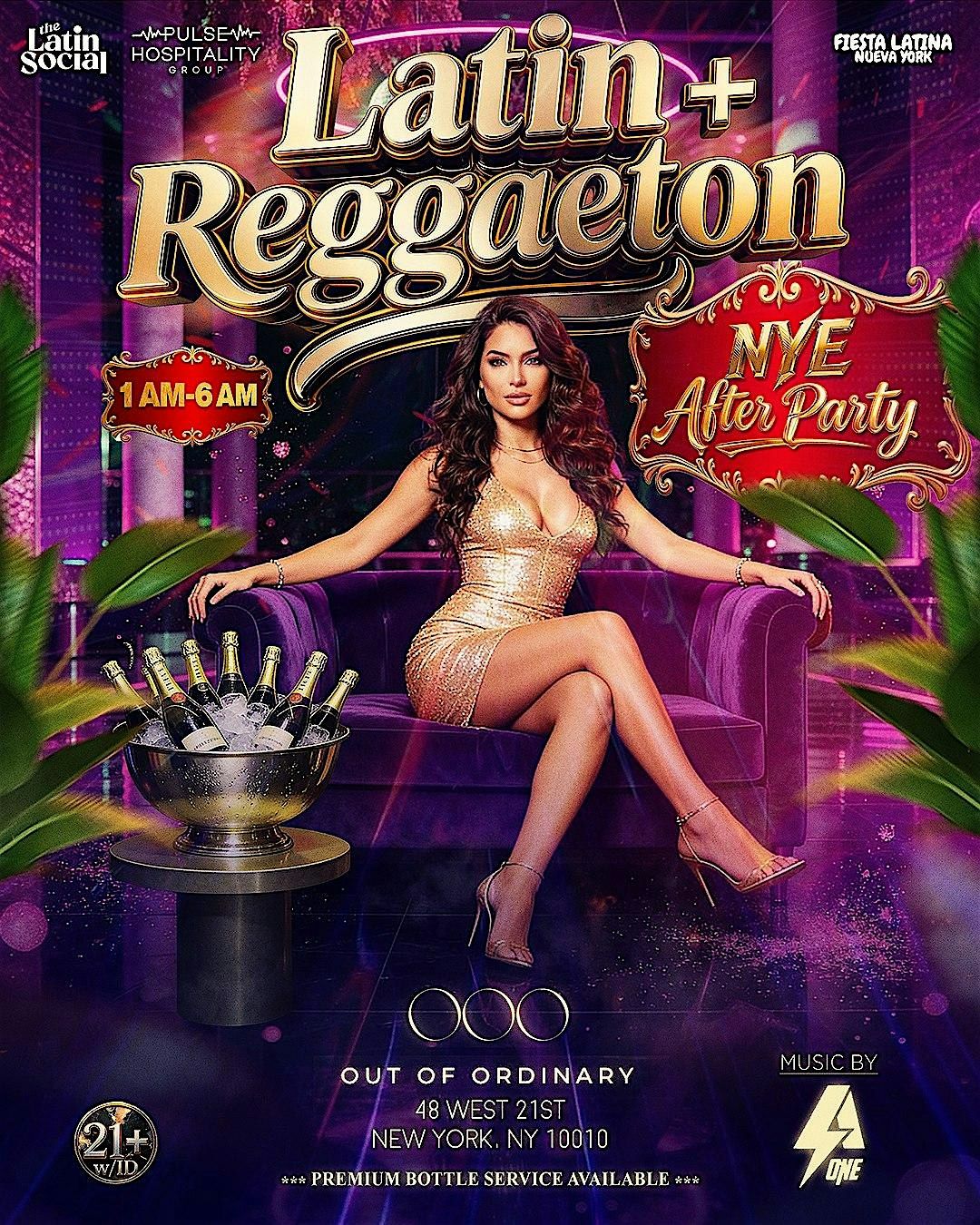After the ball drops, the real celebration begins at the NYE Latin & Reggaeton After Party at Out of Ordinary Nightclub in Flatiron, Manhattan.