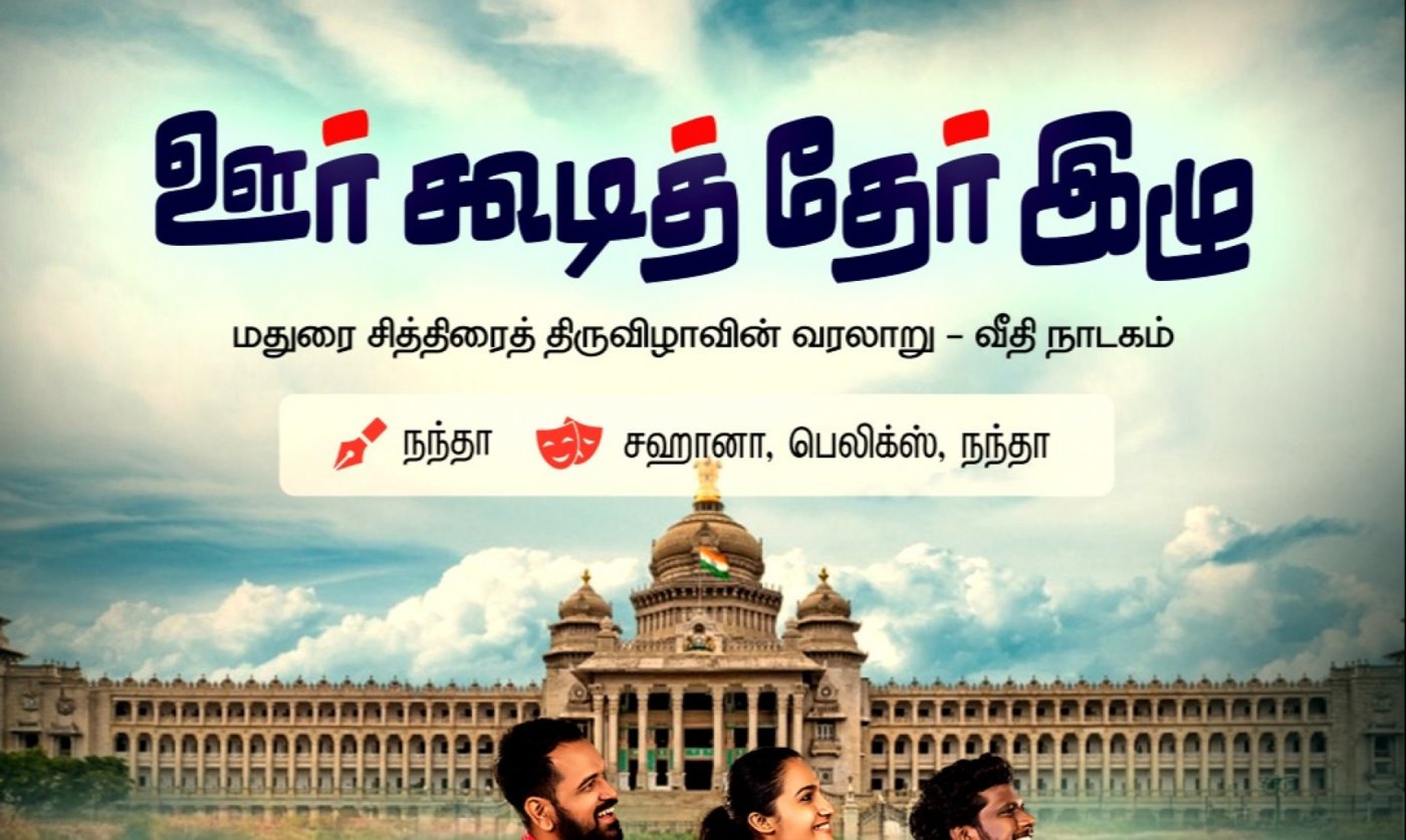 Oor Koodi Ther Izhu, 1 hour Tamil play is based on the works of renowned cultural anthropologist Tho. Paramasivan, So. Santhalingam, Chithirai Veedhikaaran and based on field research in villages of Madurai