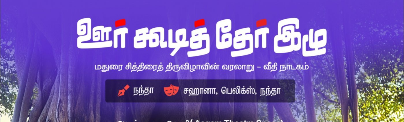 Oor Koodi Ther Izhu (Celebrating togetherness) is a 60-min Musical Tamil street play that delves into the history of Madurai’s Chithirai Thiruvizha, exploring the vibrant folklore surrounding the festival, and conveying meaningful messages of societal unity, equality, and communal harmony. The play emphasizes the purpose of the festival, which is to celebrate togetherness without taking a religious/political bias in narration. Come and celebarate with us on 28th February, Saturday at Arena Art Space, ECR, Chennai.