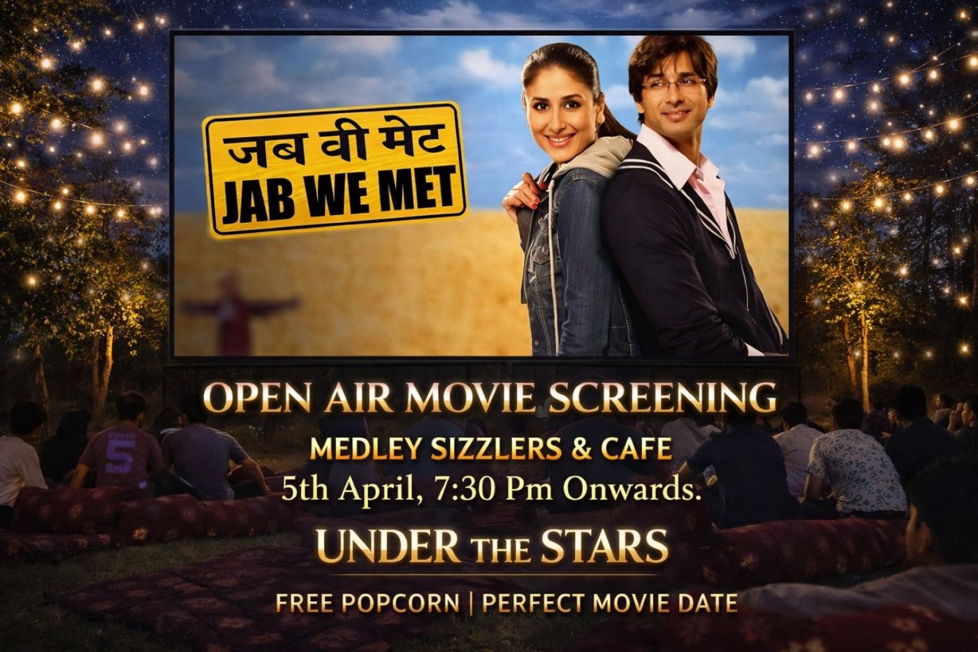 Experience the magic of cinema under the starlit sky at the 'Open Air Movie Screening: JAB WE MET- Under The Stars' event, hosted by Medley Sizzlers & Cafe!