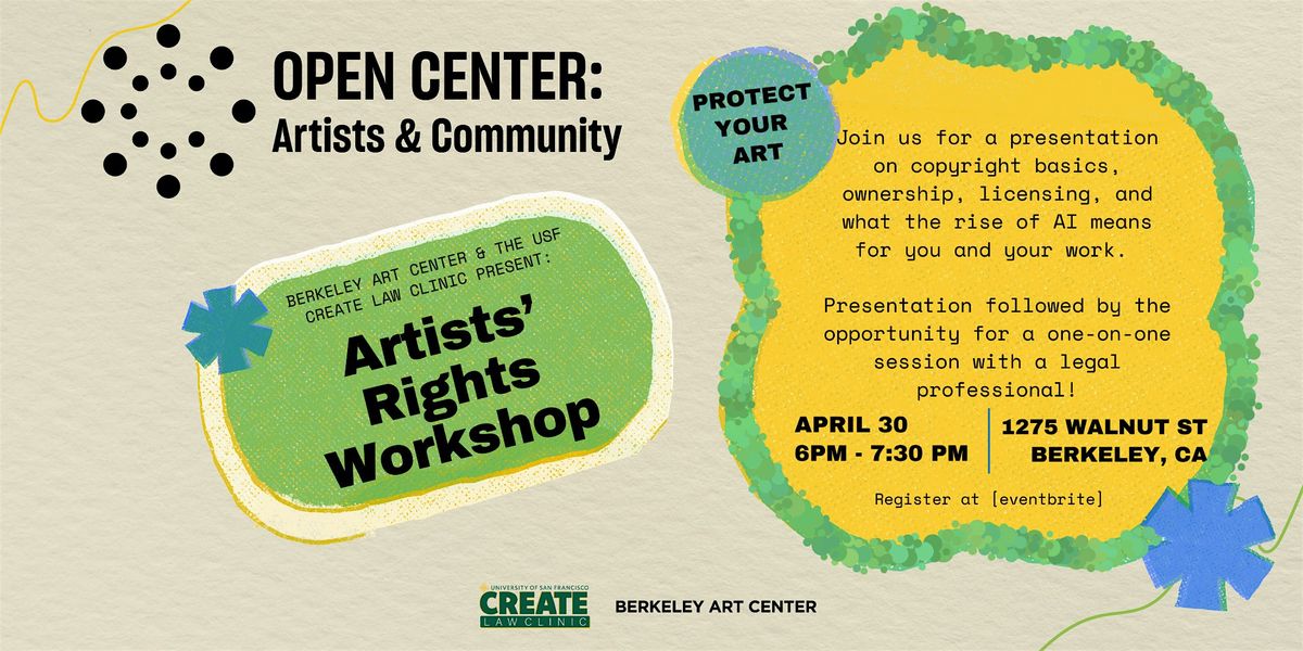 Join the USF CREATE Law Clinic and Berkeley Art Center for a free workshop on artists’ rights. This session will cover the basics of copyright, ownership, licensing, and what the rise of AI means for your creative work. Designed for artists, musicians, and creatives of all kinds, this workshop will help you better understand how to protect your work and navigate the legal side of being an artist. After the presentation, there will be time for networking and an optional one-on-one info session with a legal professional.