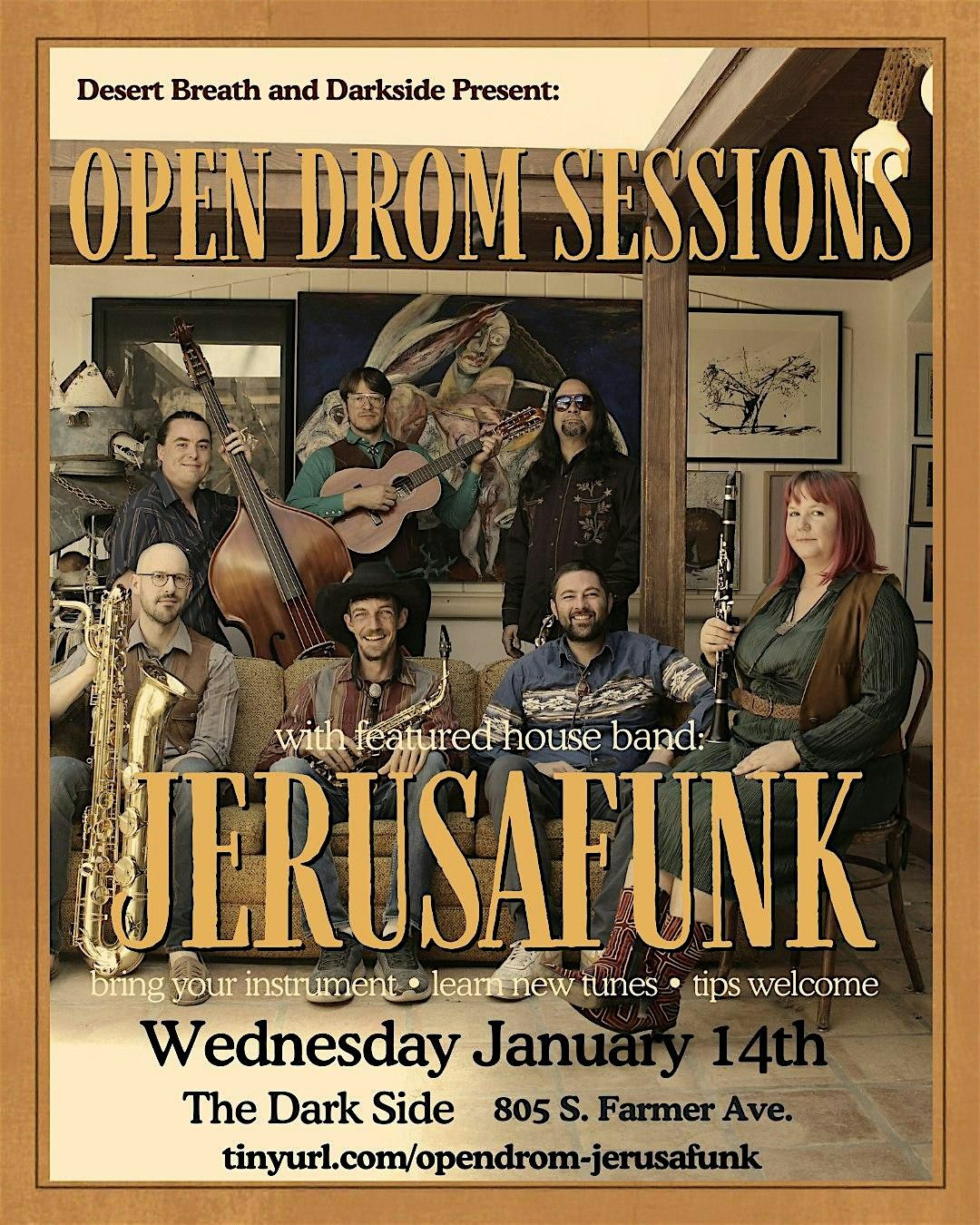 This month features Jerusafunk as the house band. Jerusafunk's groove reigns supreme and musical boundaries dissolve into a vibrant tapestry of sound. Our six-member band is at the forefront of genre-bending, interweaving the infectious rhythms of traditional funk and disco with an avant-garde twist that defies convention. Inspired by world music genres such as Jazz, Bossa Nova, Cumbia, and Taksim with high-energy performances that pulse with creativity, we invite you to immerse yourself in a musical journey unlike any other.