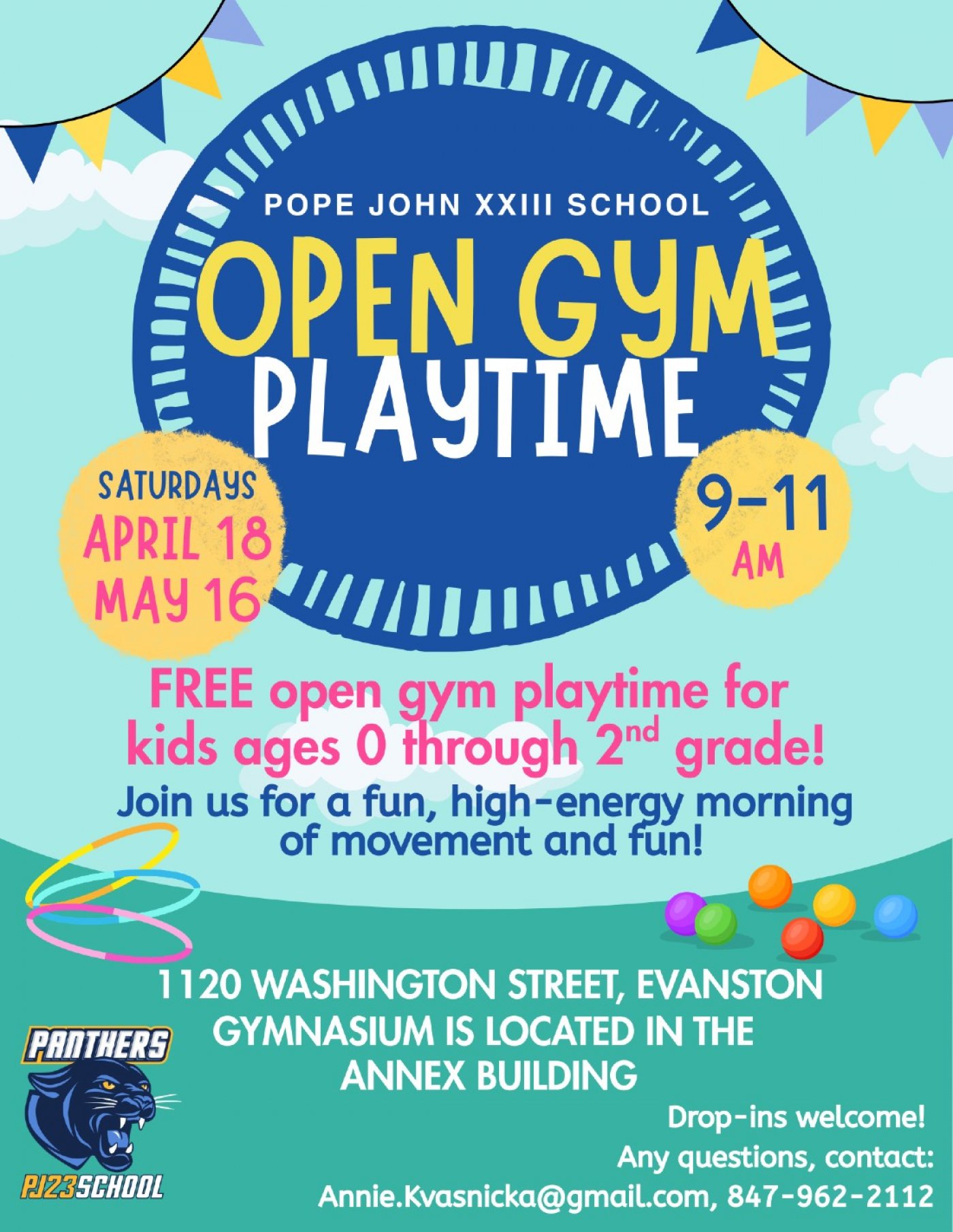 Free open gym playtime for kids ages 0 through 2nd grade! Join us for a fun, high-energy morning of movement and fun! Drop-ins welcome!