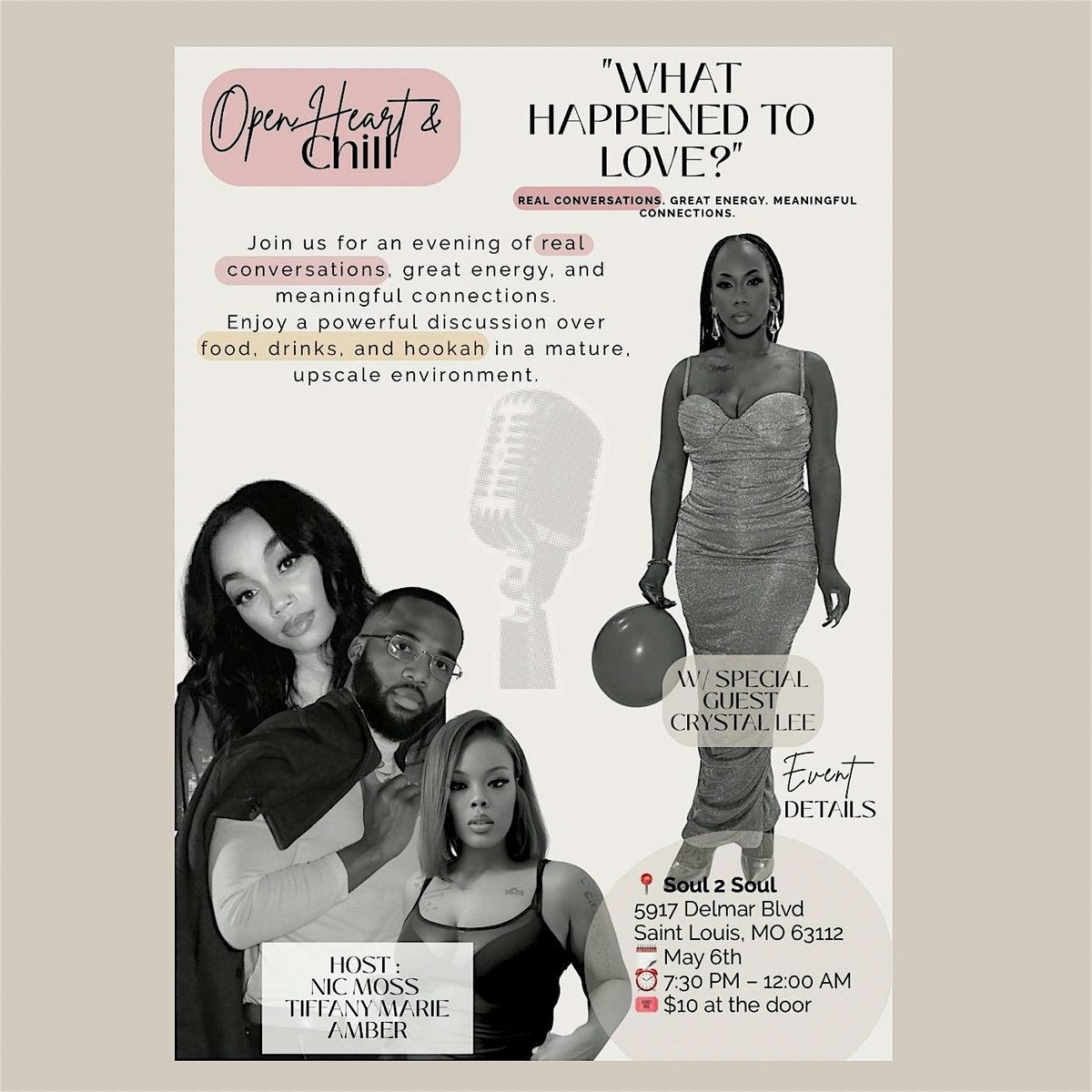 Who’s really the problem in relationships today? Come talk about it. Food, drinks & hookah. May 6 | Open Heart & Chill