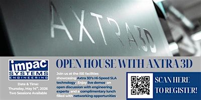 Join Impac Systems Engineering for an exclusive open house in partnership with Axtra 3D. Experience the latest in high-speed, high-precision 3D printing and discover how Axtra 3D’s advanced Hybrid PhotoSynthesis (HPS) technology is transforming polymer additive manufacturing.
