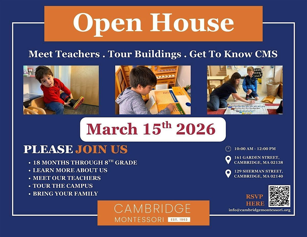 Join us for an Open House at Cambridge Montessori School and experience our vibrant learning community firsthand. Meet our dedicated teachers, tour our classrooms and campuses, and learn more about our Montessori approach for children ages 18 months through 8th grade.