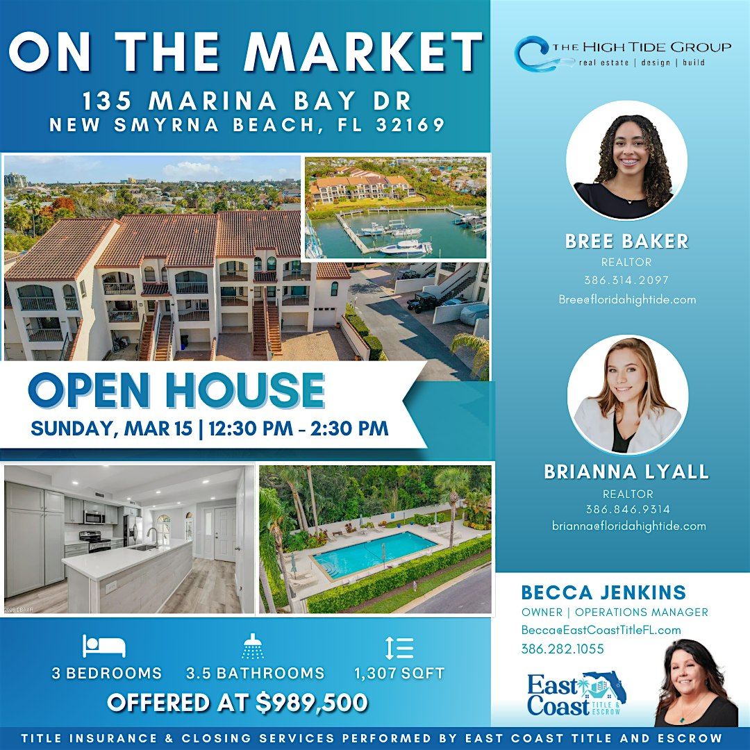 Explore coastal living at 135 Marina Bay Dr, New Smyrna Beach, FL 32169 during our Open House on Sunday, March 15 from 12:30 PM – 2:30 PM. This beautiful 3-bedroom, 3.5-bath condo with 1,307 sq ft offers modern finishes, marina views, and access to a community pool—perfect for enjoying the New Smyrna Beach lifestyle.