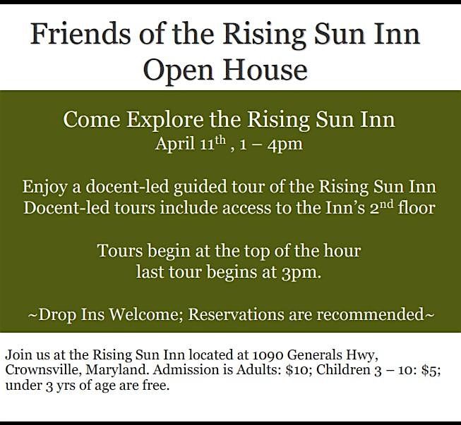 The historic Rising Sun Inn, located at 1090 General's Hwy in Crownsville, Maryland, will be open for public touring on Saturday, April 11, 2026, from 1:00 p.m. – 4:00 p.m. with tours beginning on the top of the hour. Admission is $10.00 for adults, $5.00 for children 3 - 10, and children under 3 are free.