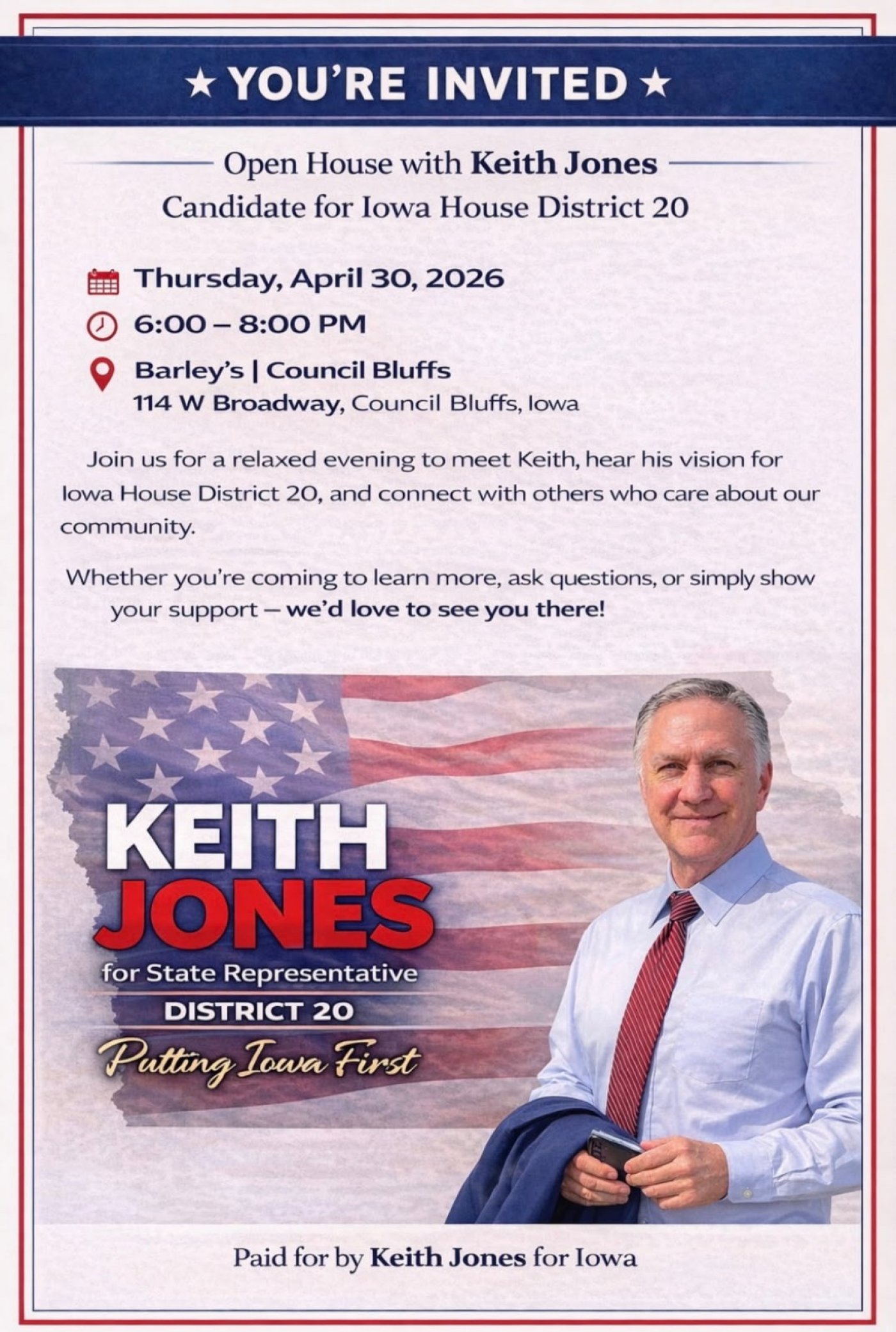 Relaxed open house to meet Keith, learn about his platform for District 20, and connect with fellow Republicans.