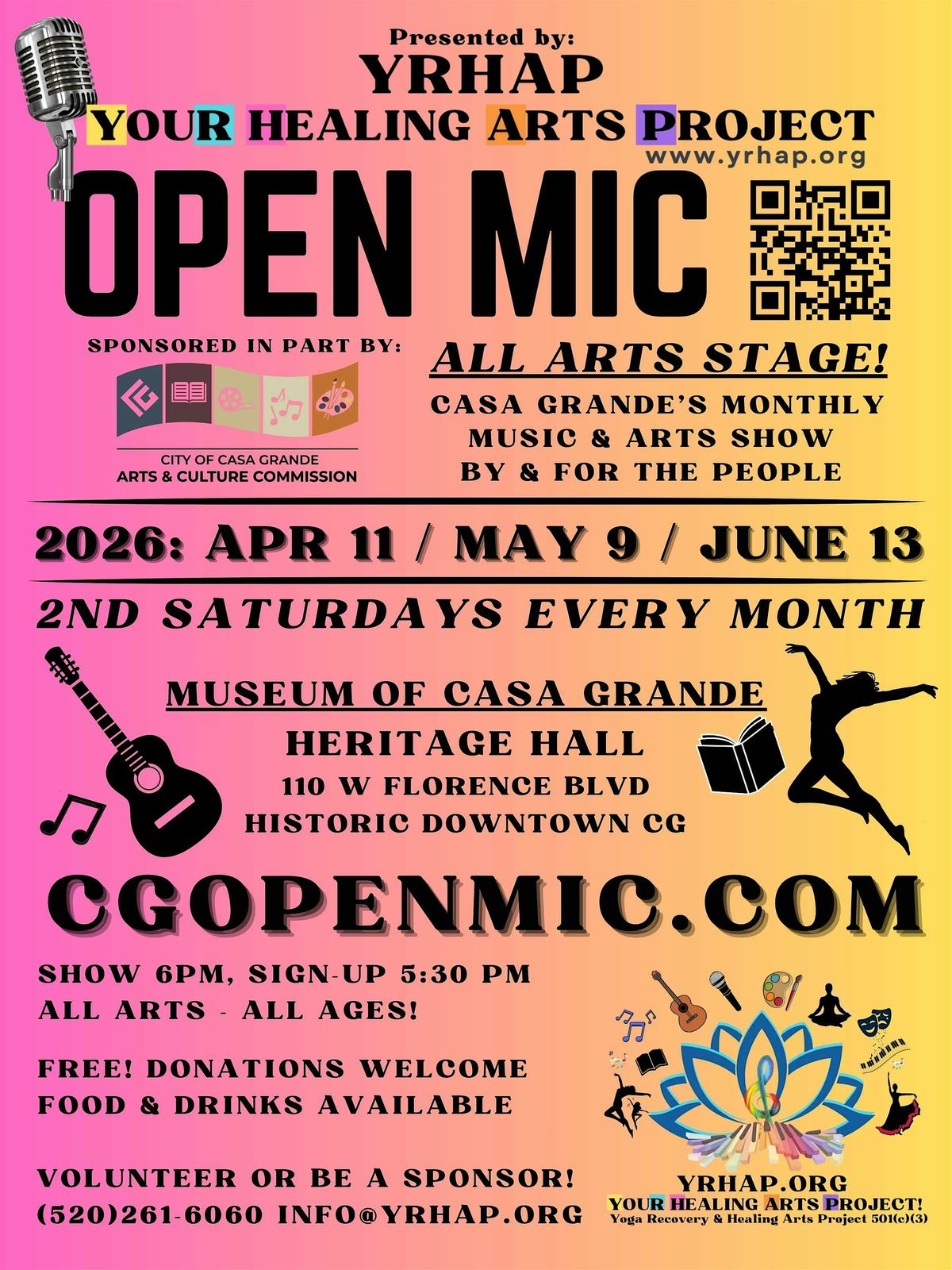 ABOUT THE OPEN MIC ALL ARTS STAGE: Come enjoy Casa Grande's MONTHLY talent showcase by & for the people! Share your talents on the all-arts community stage, get creative and inspired, and encourage and support other artists in the community. All creative mediums welcome including: musicians, vocalists, poetry, dance, visual art, performance art, rap, comedy, storytelling, juggling, skill demonstrations, skits & sketches, and more! See you on the stage or in the audience! Please keep it clean, all ages show. Thank you for supporting your own creativity, your local community, and the power of the arts.