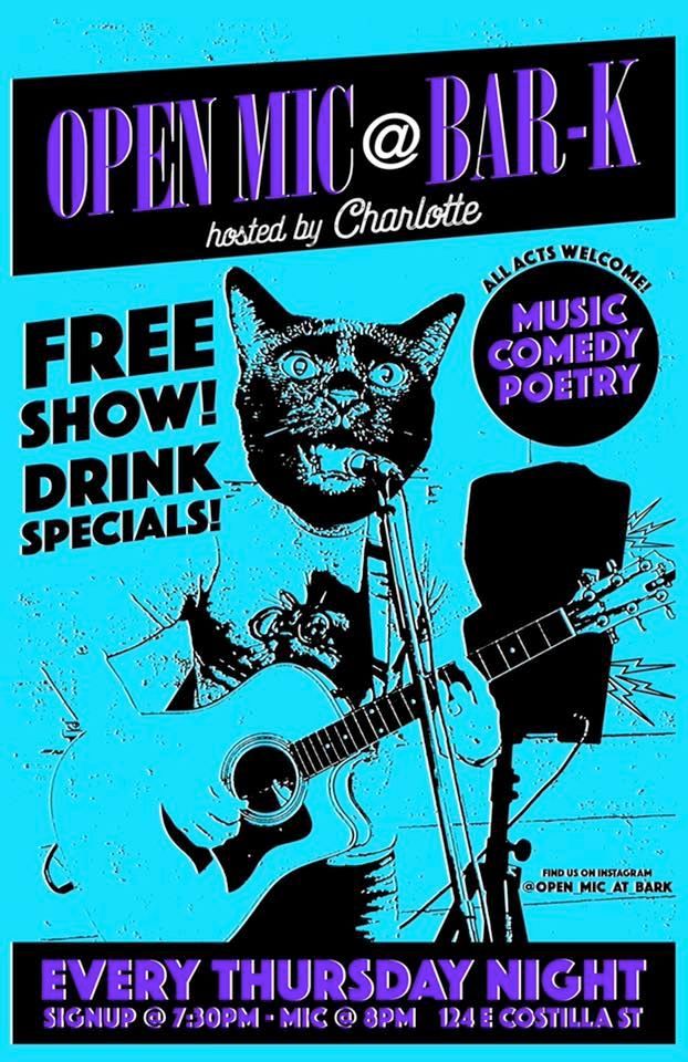 Welcome to Open Mic night at the one and only Bar-K Cocktails! Open mic is every Thursday at 8PM!