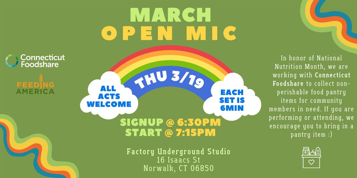 Join us for our Open Mic Food Drive at Factory Underground Studio Thursday 3/19!