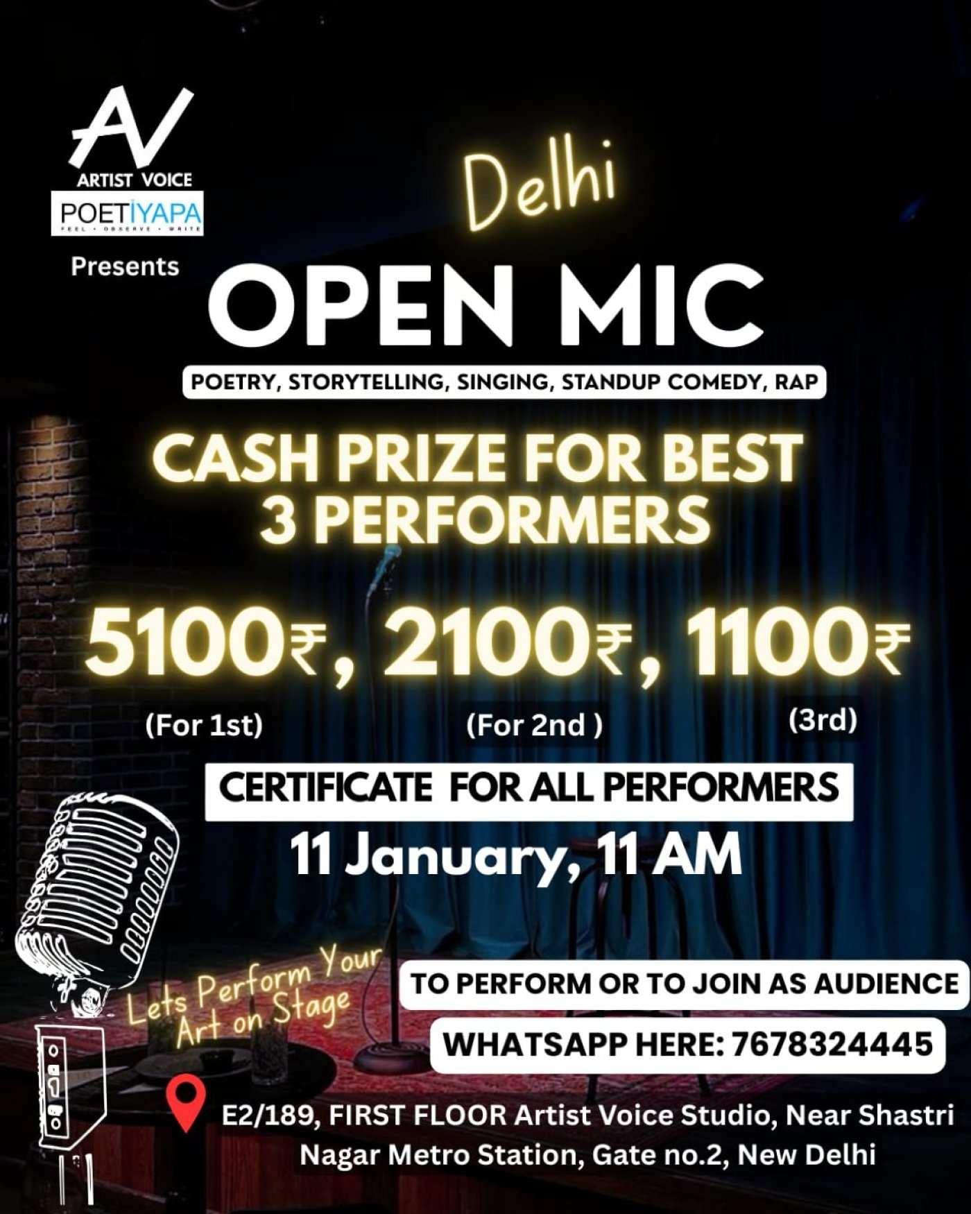 Join us at the enchanting Artist Voice located on the First floor, E2/189, Street No. 4, Block E2, Shastri Nagar, Delhi, 110052, India, New Delhi. This event promises an immersive experience for poets, storytellers, singers, stand-up comedians, and rappers to share their voice and passion with a supportive audience.
